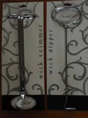 The wick Dipper is used to put out the candle and will eliminate the smoking and bad smell that occurs when you blow-out a candle. The wick Trimmer has a measured footing and is used to trim the wick to the appropriate length to avoid sooting from the candle while it is burning. These items are new and unused. I bought them in bulk for my candle business, but have since quite the candle business and have a LOT left. They are great tools and make Great gifts too! (Info from manufacturer) Durable. Functional. Patented. Trims to ¼ inch every time. Most candle manufacturers recommend keeping a wick trimmed to ¼ inch at all times to reduce soot emissions and enhance burning performance. To prevent secondary ignition, they also recommend eliminating the presence of foreign matter, such as wick trimmers, into a candle. The CleanCut Wick Trimmer does both. It features a perfect handle angle and pre-measured foot -- both of which are crafted to effortlessly trim any wick to ¼ inch, guaranteed! A precise cut ensures a cleaner, safer candle burning. Once cut, trimmings are collected in a built-in debris tray for easy disposal. As elegant as it is functional, the Wick Trimmer has an intricately detailed pattern gently carved into its durable stainless steel handles, accentuating any candle and home d©cor. CleanCut Designer Dippers are sturdy stainless steel, and a no mess, no fuss method for putting out a candle. Blowing out a candle to extinguish its flame can leave a room smelling like smoke. It may also create black residue, which can settle on walls and furniture. The CleanCut Wick Dipper is an easy-to-use tool that extinguishes a flame in a way that results in a cleaner, smoke-free candle. Made of stainless steel, it has a hook designed to push the burning wick into molten wax and pull it straight up again. This method of dipping the wick in wax also allows for easier relighting of the candle. And the strategically placed no-mess curve at the end of the dipper ensures no waxy residue touches tables or counter tops. CleanCut Designer Dippers are the perfect way to extinguish a candle -- while igniting your customers passion for elegant home accessories. Instructions for Use: 1. Use CleanCut Wick Dipper to push the wick into the liquefied wax pool until the flame is completely extinguished. 2. Immediately pull the wick from the wax and straighten. 3. Allow time for the molten wax to solidify before using a CleanCut Wick Trimmer to trim the wick to ¼ inch length again. $8.00 is for the set. I will sell them separately if you only want 1 item. $7.50 for Wick Trimmer $1.50 for Wick Dipper Cheaper prices available for larger quantities. (a dozen or more)