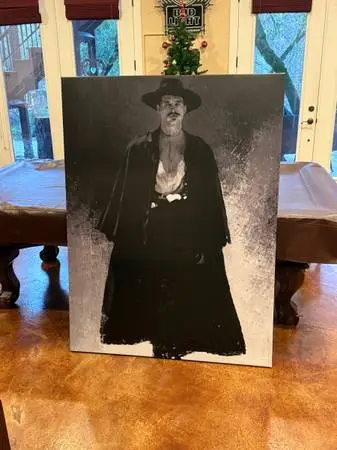 Doc Holiday wall art!!! Brand new!!!! Regular $650. $250 here!!! They sent two by mistake!!! This is big!!! 45”x 60” Please email or call!! Thanks Product Info – Artist: Andy Brackpool Made in Plano, Texas, USA Canvas Prints Museum Quality Canvas (330 GSM giclée) Stretched over 1.25 recycled North American poplar wood State-of-the-art printing methods with Canon GREENGUARD Gold Certified Ink to ensure vivid images Sawtooth Hangers pre-installed. All prints come ready to hang Reinforced backing on all prints so that your canvas never sags Framed Prints Crystal-clear acrylic shield Premium wood frame High quality matte photo paper Thick white border overlay Sawtooth Hangers pre-installed. All prints come ready to hang 1.25 fame depth