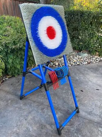 Stands over 5 feet tall and is constructed out of 1.5 inch steel tubing. The 8 axes are constructed from plastic and foam and are specifically designed to stick in the unique bristle target. For indoor or outdoor use. Cash, pickup in Windsor. Respond if interested and mention item, generic emails will not be returned.