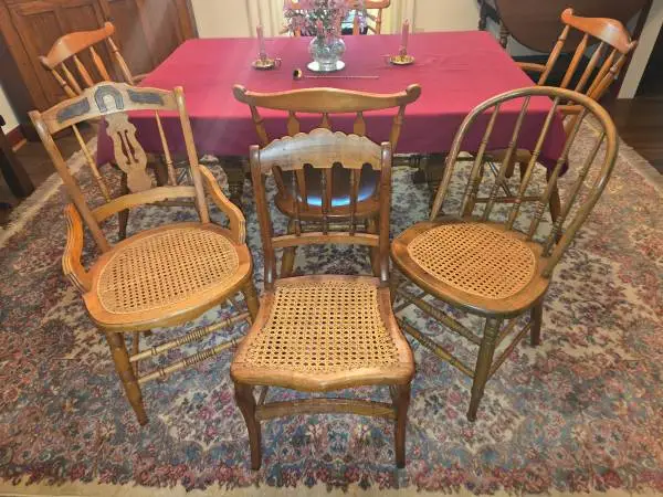 Antique solid maple wood chairs with cane bottoms in excellent condition, no scratches or issues. Super strong, stable and very comfortable. These have been in non-smoking and pet free, family home and are in perfect condition. Individually each being sold $60. Or all three for $150. Thanks for looking and contact Kevin with questions or additional information. No matter why you choose cane furniture, this trend is likely to continue as people seek unique design choices for their homes. A sustainable product that has been around for centuries and adds a touch of warmth to any design style will not fade easily. Antique Solid Maple Wood, Ladder back with Cane bottom Seat Chairs 18L x 17D x 32H - 18 FROM FLOOR TO SEAT English Furniture Styles Queen Anne – 1701 to 1714 English Baroque Graceful curves Curved ‘cabriole’ legs Claw-and-ball feet Scallop shell or scroll motifs Oak Cherry Walnut Mahogany Georgian Styles – 1714 to 1830 (styles changed radically during this time) Thomas Chippendale Thomas Sheraton Carved decoration, gradually replaced by wood inlay Baroque Palladian Ornate carvings Walnut and walnut veneers on oak Jappaning (an imitation of Japanese lacquer work) Rococo Gothic Rich upholstery Robert Adam Rosewood and satinwood veneer Empire style Classical motifs Regency – 1795 to 1837 Bold curves Functional Simple Mahogany John Nash Neoclassical motifs Far-Eastern influences Victorian – approximately 1830 to 1890 Marble tops Bulky design Dark finish Pugin Greek influences Gothic Rococo Art Nouveau (very early) American furniture styles American Colonial Styles – Early 1620 to 1730 Late 1730 to 1780 Heavy decoration Pine Walnut Birch Maple Windsor chair Interpretations of English styles (Queen Anne and Georgian)with square lines Federal – 1789 to 1823 Duncan Phyfe variations on the Sheraton style Boston Rocker Hitchcock chair Cherry Mahogony French influence Pennsylvania Dutch – 1720 to 1830 Plain and solid furniture Germanic style Painted furniture Pine Maple Fruitwoods widely used Walnut Shaker – late 1800s to early 1900s Mostly maple and pine Strictly functional with no decoration Excellent craftsmanship Highly original designs Wayfair, Bassett, Ethan Allen, havertys, four hands, Ashford, huxley, accent, arm chair, Broyhill, hickory, Rochester, sofa, recliner, rocker, captain, Ashley, barcalounger, catnapper, klausner, Jackson6, klaussner, pottery barn, American leather, pier one, bench, table, natuzzi, Franklin, futura, Pottery barn, havertys, dorm, fraternity, sorority, deck, porch, mountain house, lake home, basement, garage, patio, west elm, IKEA, cost plus world market, Ashley furniture, Sarah solid top, Weston, amish, georgia furniture mart, luxe, charterhouse, Dutch crafters, American signature, antique, round, oval, kitchen, bedroom, dining room, tv stand, emmitt, blaneville, basement, changing table, family room, den, sofa, chair, Chesterfield, Westwood,couch, loveseat, recliner, wingback, leather, Pottery barn, havertys, west elm, IKEA, cost plus world market, Ashley furniture, Sarah solid top, Weston, amish, furniture mart, luxe, charterhouse, Dutch crafters, American signature, antique, round, oval, kitchen, bedroom, dining room, tv stand, emmitt, blaneville, basement, family room, den, sofa, chair, la-Z-boy, Wayfair, Bassett, Ethan Allen, havertys, four hands, Ashford, huxley, accent, arm chair, Broyhill, hickory, Rochester, sofa, recliner, rocker, captain, steelcase, barcalounger, ikea, klaussner, pottery barn, American leather, pier one, bench, table, natuzzi, Franklin, futura, college student, tailgate, fraternity, sorority, basement, porch, patio, deck, workspace, haworth, knoll, surface pro, ipad, laptop, keyboard, monitor, printer, office, arts and crafts, business, school, college, dorm,