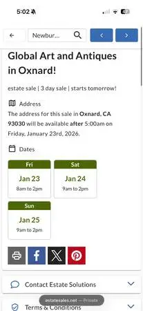 715 West Robert Ave Friday-Sunday January 23-25th https://www.estatesales.net/CA/Oxnard/93030/4765203 Address will be posted at the the day of the sale! Get ready for another fantastic sale, this home in Oxnard has been packed with art, antiques, and collectables that span the globe over the last 50 years. A longtime Oxnard resident (this home for 48 years), US Navy veteran and world travelers belongings will be available. A plethora of art, including many oil paintings, Asian art from many countries, as well as bronze, marble and wooden statues from around the globe. Multiple rooms packed with ceramics, extensive wicker art and antiques, pottery, glass and crystal. Nice selection of beautiful Japanese pieces, including a stunning Ikebana, ceramics, and metalwork. flatware sets, Multiple sets of fine china. Beautful collection of Lladro. Lots of military memorabilia, specifically Navy Nurse Corps, including old uniforms, flags, buttons, pins, challenge coins and more. Shelves full of books! Additionally closets full of vintage purses including exotics, beaded and lots of leather, tons of accessories, belts and hats. Clothing includes hundreds of outfits, vintage kimonos, Pendleton, Givenchy and countless other brands. Large selection of shoes, and lots of vintage jewelry! Don’t miss the records, CDs, New in box reel to reel, as well as speakers, TVs and audio equipment! The house is packed with lots of smalls, furniture, artwork and the garage even has garden tools, shelving, patio furniture and more. While we always do our best to display as much as we can, there simply is not enough room in the house to lay it all out so come prepared to dig! -records, 8-tracks, cassettes and CDs, as well as audio equipment. -jewlery, watches, lighters and pocket knives. -books -lots of paintings, oils, watercolors, etchings, charcoal, wood art and more. -tools -furniture -crocks, farm antiques, pottery, ceramics, porcelain, glassware, crystal and more. -fine china, serving ware, and flatware (multiple sets of all) -tons of vintage picture frames -lots of Japanese, Italian and French art and antiques. -lots of military items, including plaques, awards, flags, uniforms, books, pins and more -vintage perfumes -tools and yard items, including lots of decor -African drums, stools, carvings and more -southeast Asian art, hat collection and more -closets packed full of vintage clothing, purses, shoes, and accessories. -tvs and electronics -household goods, pots and pans, cutco cutlery and more. -tons of vintage Christmas there are thousands and thousands of amazing items displayed, and tons more in cabinets, drawers and just about every other spot in the house! dates:friday 2026-01-23 saturday 2026-01-24 sunday 2026-01-25 start time: 8am Fri 9am Sat/Sun