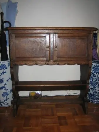 Antique Oak Table with Book Bin 2 Door Functional Storage C1900 Excellent Condition Pretty Scalloped Front and the Side Legs are also Scalloped Design with Center Storage Shelf that can Display books or other things. Table top has Slanted Corners. Very Handsome! Cash Only ONLY! 28L x 293/8H x 113/4 Table Top Depth ( Bottom Depth 10) ONLY IN PERSON TRANSACTION!!! Must come and see in person! NO SENDING SOMEONE OUT, OR ADDING EXTRA DELIVERY FEE, ETC! CASH, ZELLE USING YOUR BANK ACCOUNT, or I WILL ACCEPT A PERSONAL CHECK , BUT WAITING PERIOD OF 2 WEEKS OR SO TILL CHECK CLEARS FOR PICK UP. NO MONEY ORDER CASHIER/CERTIFIED CHECKS. PLS DO NOT WASTE MY TIME OR YOURS MAKING A RIDICULOUS OFFER!!!!! ITS NOT FUNNY!!! SCAM ALERT!!!! SCAMMER SUSAN ALEX. WATCH OUT FOR SUSAN ALEX. SHE EMAILED AND TRIED TO SCAM ME. THE USUAL SCAM TACTIC! IT SHOWED AS SUSAN ALEX. I FLAGGED HER.