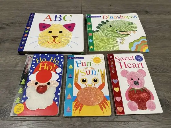 ♥ ♥ ♥ ALPHAPRINTS BOARD BOOKS ~ ABC, DINOSHAPES, HO,HO,HO! FUN IN THE SUN! SWEET HEART 5 Beautiful Board Books! Excellent Condition Comes with the books in the pictures Pick up 192 nd & Harrison area Text 402-889-5046