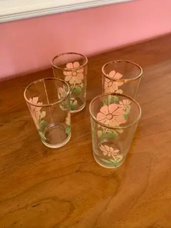 Set 5 w/hand painted flowers. Photo only shows 4, located 1 additional. Gold Rimmed. NEW, never used. 31/2 H, 2 Rim Dia., 5 oz. Vintage, 1940 s. Please call 585-236-0505. Will Pack and Ship. If posted its available.
