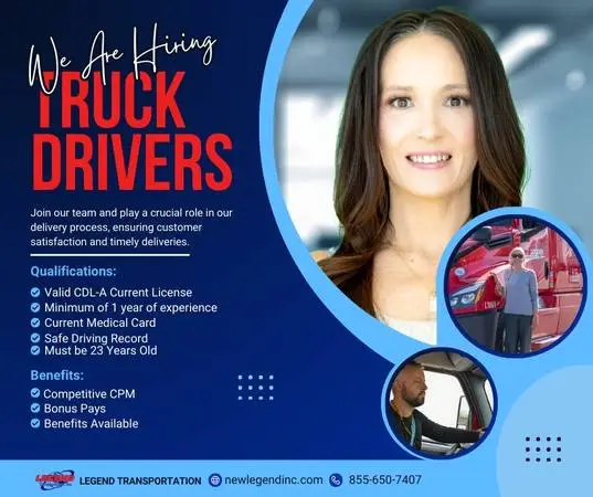 NOW HIRING DRIVERS FOR TRI-STATE CA-NV-UT Primarily Running CA-NV-UT Drivers average 2750 miles weekly 70 hours running then 34 hours reset at home with weekly pass through home opportunities THE M 1 Y 0.60 CPM US Military Veteran + 0.02 CPM Optional Pay Per Diem Detention Pay Layover Pay Extra Stop Pay Driver Assist Pay Level 1 clean inspection Bonus Monthly Bonus +Fuel .02 CPM, Safety .02 CPM Hazmat Endorsement holders + $75.00 for every Placarded Hazmat Load DRIVER PERKS Paid Orientation and Travel Weekly Pay Pet Policy Passenger Program 18 Driver Referral ProgramRefer your buddies!! 2022-2025 Fr 8 liner, Kenworth & Volvo trucks! Health, Dental, Vision, Available Short & Long Term Disability Available 401 K 100 No Touch Fr 8 REQUIREMENTS! Class A CDL Current License Must Be 23 Years Old Current Medical Card Minimum 1-year of Tractor + Trailer or Reefer Experience in OTR or Regional Driving Safe Driving Record https://intelliapp.driverapponline.com/c/legends?r=ccr Call Us For More Information 855-650-7407 Legend, New Legend, Transportation, dedicated, dedicated fr 8, trucking, truck driving, trucker, OTR, long haul, over the road, team drivers, teams, trucking company, truck, CDL job, CDL-A truck driver, class A job, truck driving jobs, truck drivers, CDL-A, commercial driver, CDL, Class A driver, regional, lanes, route, bonus, veterans, no-touch fr 8, pet friendly, home time, best pay