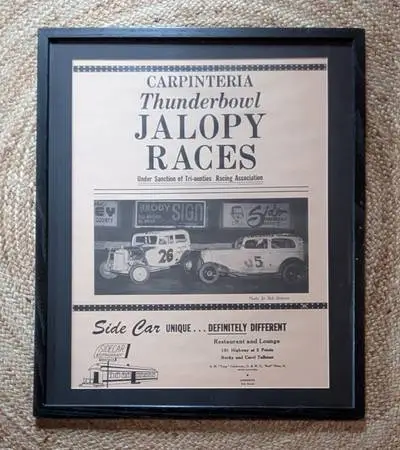 Rare Original 1950 s Carpinteria Thunderbowl Jalopy Races framed 17 x 23 poster in good condition.Call or Text 615-686-5728 if interested.