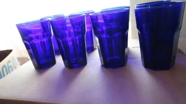 I HAVE 8 COBALT BLUE DRINKING GLASSES MADE IN U.S.A. BY LIBBY IN GOOD CONDITION 5 INCHES TALL VERY NICE. $65.00 LOCATED IN NABB, INDIANA WHICH IS 18 MILES NORTH FROM THE EAST END BRIDGE AND JUST RIGHT OUTSIDE OF CHARLESTOWN INDIANA. CALL OR TEXT I ONLY TAKE CASH NO OTHER. 502-291-0825.