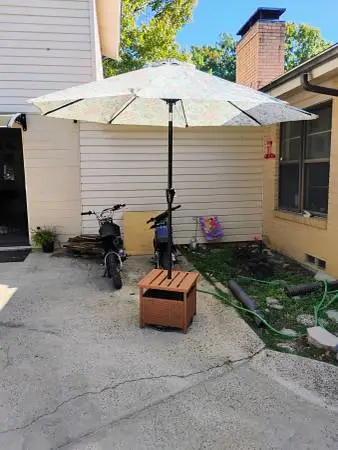 This umbrella is in great condition and has a metal bamboo style table. Call or text 214-718-9518