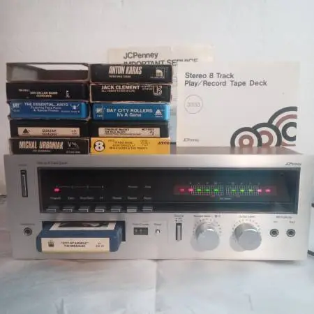 Hi I have a JCPenny 8 Track Player with 10 tapes and instruction manual. for sale. Player works but being sold as is sometime some tapes dont want to automatically switch tracks. Or a few times it seemed to play entire tape in 1 track. Has great sound and tapes had new foam put in years ago. I think its the black plastic piece to the left of the head. My guess Im not a expert on 8 track players. If interested or have questions or want to check it out give me a call Chad 160-652-1405. Thanks asking $50 for this package. Woodgrain in good condition. Cash only I do not ship.