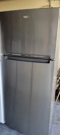 Whirlpool 18 Cubic Ft. Stainless Steel Top Freezer Refrigerator that has nice side bins, nice glass shelving, nice drawers, beautiful lighting, gets real cold & works real nice. No major dents , scratches, in real pristine shape. Cleaned & sanitized inside & out. Can deliver for a extra fee depending upon what city your located in. ASK for Mike @ 805-443-7589