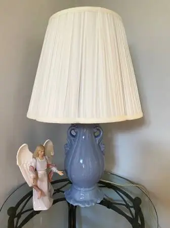 Beautiful assembled vintage light blue ceramic accent table lamp. with vintage off-white pleated lampshade. The lamp is 12 tall from bottom to socket and 20 tall from bottom to harp top Great condition. CASH ONLY Text if you are interested: 646-673-1516 I can meet you near Walgreens, located at 3501 Lomas Blvd NE. I will no respond to codes or unusual payment methods. Please dont text me with a request to email you back. Thank you