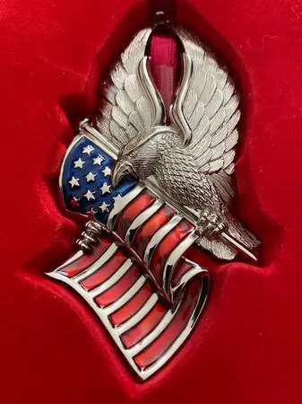 New Eagle Of Liberty Silverplated American Flag Christmas Ornament by Gorham in original box. Size - 4.25 in. CASH ONLY Text if you are interested: 646-673-1516 I can meet you near Walgreens, located at 3501 Lomas Blvd NE. I will no respond to codes or unusual payment methods. Please dont text me with a request to email you back. Thank you