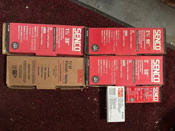 Senco 2 -1/2 galvanized 15 gauge finish nails 20.00 Senco 2 galvanized 15 gauge finish nails 30.00 Senco 1-1/2 galvanized 15 gauge finish nails 30.00 Senco 1-1/4 galvanized 18 gauge Brad’s 20.00 All boxes are new full boxes 907-244-7091