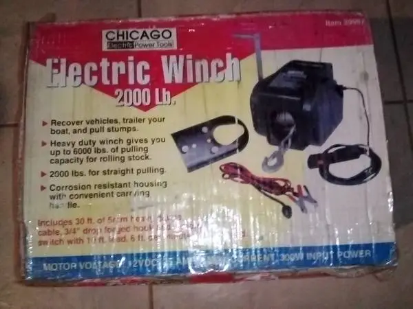 2000 Lb. Chicago Electric Winch, New in box. W/Remote Switch ,3/4 drop Forged Hook. 6000 pp Item # 3999712 volt 25 Amp. 30 ft 5 mm heavy gage cable New in Box 941-626-7449 Call or Text After 4 PM