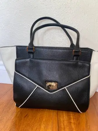 KATE SPADE Pebbled Leather bag tote 907-440-5054 $80 firm - KATE SPADE Black and Ivory Pebble Leather Tote Bag In Eagle River on Raven drive or 1251 Muldoon rd - 8-4 - Mon-Fri Exterior Front has Envelope Pocket with Clasp Closure Interior 1 Large Compartment with 2 Slip Pockets and 1 Zip Pocket 15.5 by 10.5 by 4 with 7 Strap Drop