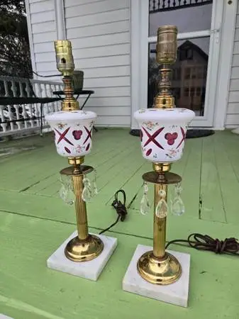 Pair of antique Bohemian glass lamps featuring brass and marble bases replete with hanging crystals. Each measures 19 tall, work fine and are in good vintage condition. No shades included Cash only $250 pair text 612-584-3614