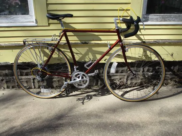 Bike is a 1985---Schwinn made these from 1983-1985--this is the best year as it was the only year with cantilever brakes. Stand over is 327/8 in. Columbus Tenax Tubing Completely rebuilt-----including candy root beer paint. New parts--paint--tires--cartridge bottom bracket--cable housings. Work d 1--wheels trued with tires removed to true both radially and laterally. Check chain for stretch--clean and lube. Pedals were grease injected as they are not rebuildable, the pedal shaft is peened over. The toe clips are adjustable, and the strap can be moved up or down with the slot at the top of the toe clip. Headset and both hubs rebuilt. Freewheel was taken apart and overhauled. Rear derailleur completely overhauled. All chrome and paint waxed. Features original Blackburn rack from the factory. Grab On foam grips, the best ever made. Bike is a 15 speed with a Suntour drive train. Gearing in the rear was increased from a 14 x 28 to a 14 x 32 Bike has original wheels, rear has the 40 spoke. Tune up of brakes--derailleurs--and lubed. It looks very nice, and rides beautifully. Frame was sand blasted---painted silver---7-8 coats of candy root beer---3 coats of clear coat. The paint is metal flake and is gorgeous in the sun. Calls only--- Mark319-232-7597