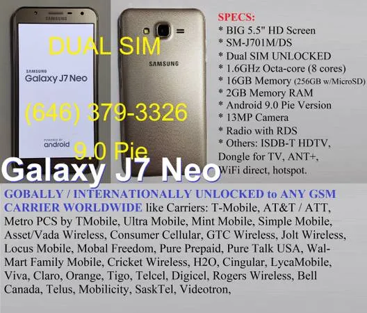 This Galaxy J 7 Neo CRACKED SM-J 701 M UNLOCKED with dual service provider like T-Mobile, AT&T, Cricket Wireless, Ultra Mobile, Simple Mobile, Metro PCS, Lycamobile, Claro, Digicel, and more. The screen is CRACKED BUT FULLY WORKING. 5.5 Super AMOLED display, 16 GB expandable, 13 MP camera, 9.0 Pie android version, and moreS 7 S 8 S 9 Prime Star. Pickup in the Bronx. TEXT me 646-379-3326. Thanks for looking!