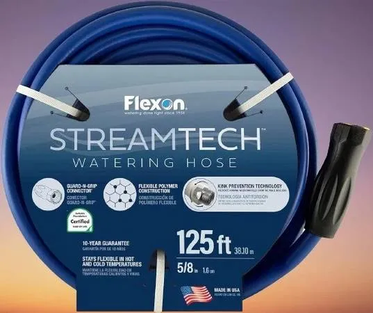 Flexon Streamtech 5/8 in. Dia. x 125 ft. Heavy-Duty Water Hose. Costs $80 plus tax new Call 716-901-0628 flexible in hot and cold temperatures 125 ft. L allows it to reach most areas of your lawn Made in the USA features a male swivel coupling with kink prevention technology which helps the hose uncoil naturally without kinking from the male end