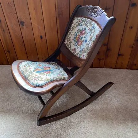 Tapestry rocking chair 907-440-5054 $180 firm - Victorian Style Folding Wooden Rocking Chair with Tapestry Needlepoint Cloth Seat and Hand Carved Wood In Eagle River on Raven Drive or during the week, I can bring it to town 8 to 4 at 1251 Muldoon Rd.
