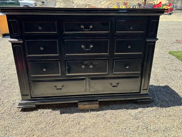 Is the bigger dresser whit all storage, only 1 of the drawers needs the Knapp like you can see on the picture, all the rest there on good condition no broken or missing mor parts really heavy and nice 45 inches tall 69 inches long 19 inches wide Good for a room or for tv stand Ready to go For more info or if you like to come and see it please feel free to message or call me at 951-764-2979