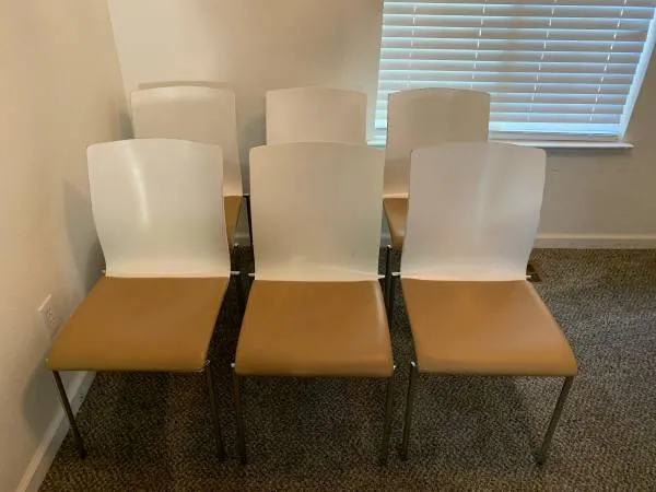 Contact me via text or call, will not respond to emails since most email responses end up in spam folder. Chairs have chrome steel bases with white painted molded plywood tops and caramel colored soft top grain leather upholstered padded seats. All were manufactured in 2014-2015 All chairs are in good used condition and show signs of use, scuffing wear to the side edges on painted tops. Leather in excellent condition. All have new plastic feet caps H34” x W19.5” x D24” Delivery available in greater SF Bay / Sacramento areas for $20-$50 depending on distance from Fairfield.