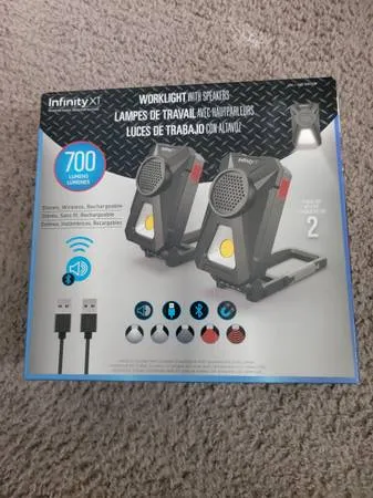 NEW Infinity X 1 Work Lights with Bluetooth Speakers, 2 pk. Call 612-735-8444. Features: 2 Pack Rechargeable Work Light 700 Lumens Dual Bluetooth Speakers 5 Light Modes Magnetic Base with Carabiner and Tilt