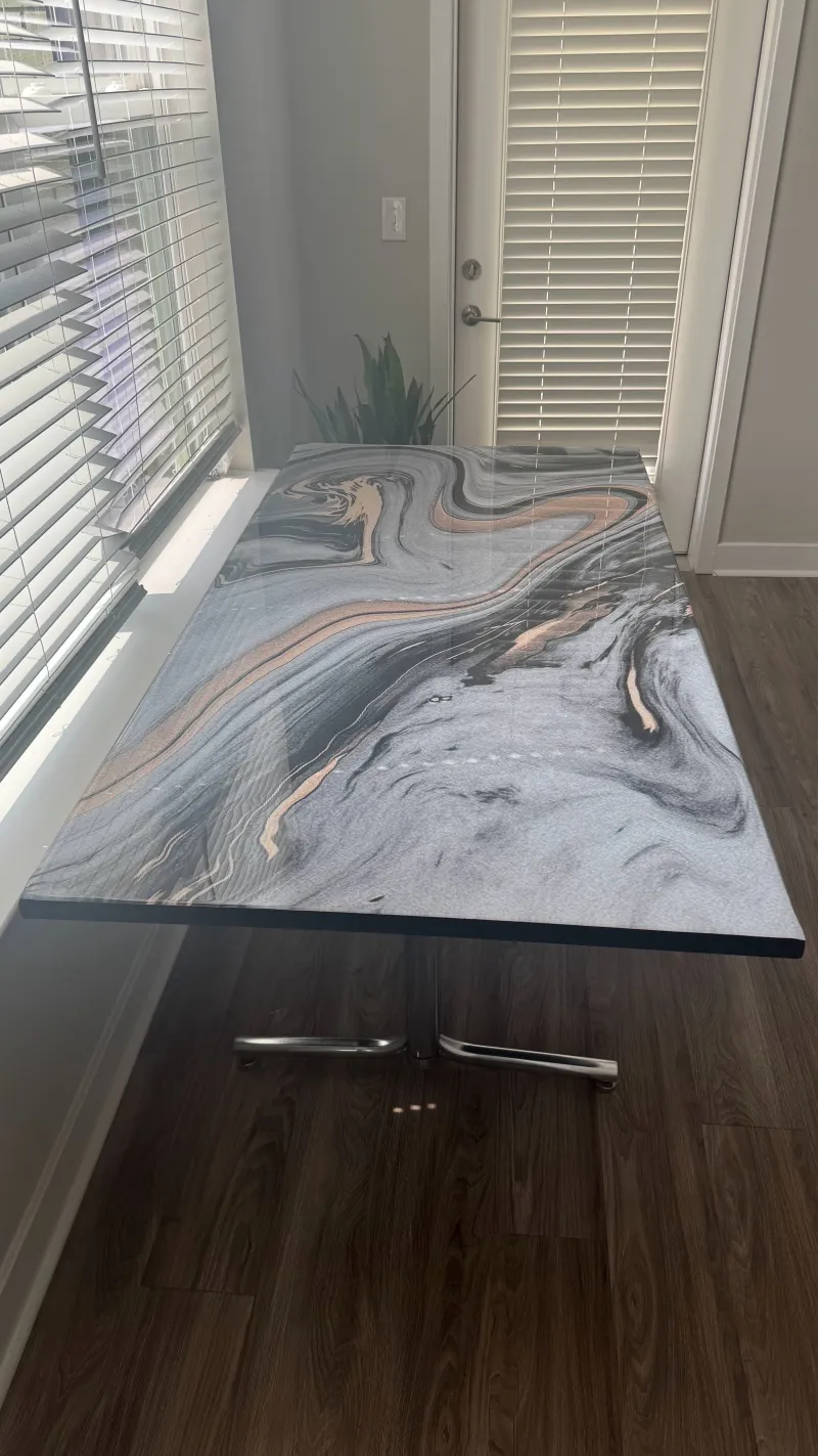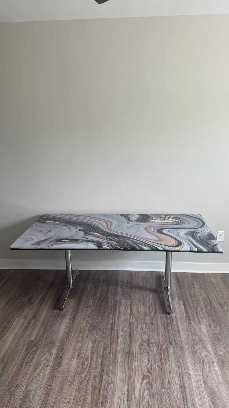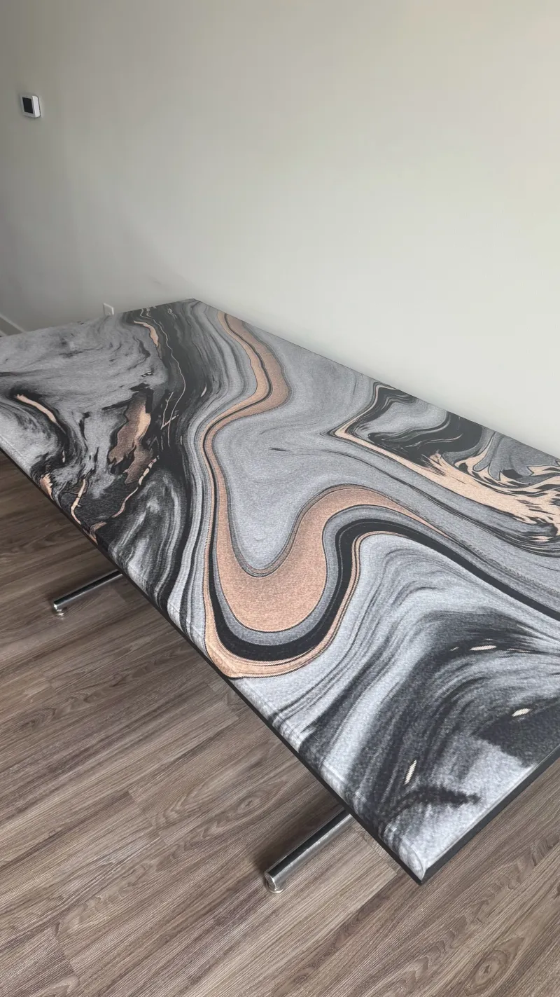 Selling this handcrafted epoxy resin desk, made with care and attention to detail. It’s my very first project, so it may have some minor imperfections, but overall it’s in great condition with a smooth, glossy finish. The surface features a marble-like swirl design in tones of black, gray, and beige – giving it a unique, artistic touch. Perfect for a home office, creative studio, or to elevate any workspace with personality. Details: • Length: 6 feet (approx. 1.83 meters)