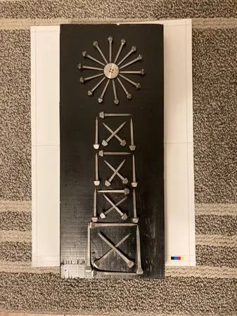 This is a piece of folk art depicting a windmill and made using horseshoe nails. From a 1938-78 s era Colorado family farm. 17 tall 7 wide and 1.5 thick Has standard picture hanger on the back. Best way to reach me is via TEXT at 720-375-4527 Or Email but please check your Email spam folder. I will reply.