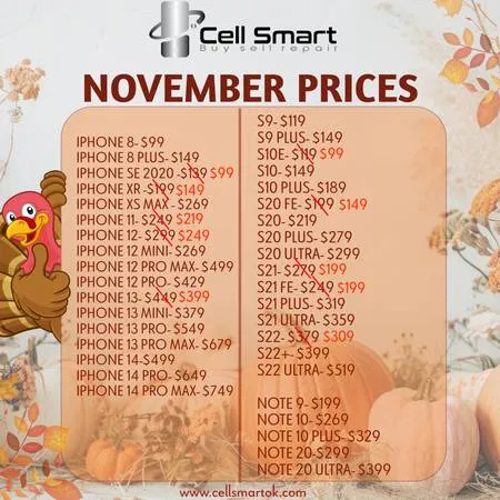 Ask us about our quick and easy approval financing option! iphone 8 $99 iphone 8 Plus $149 iphone SE 2020 $99 SALE iphone XR $149 SALE iphone XS Max $269 iphone 11 $219 SALE iphone 11 Pro- $339 iphone 11 Pro Max- $399 iphone 12 $249 SALE iphone 12 Mini $269 iphone 12 Pro Max $499 iphone 12 Pro $429 iphone 13 $399 SALE iphone 13 Mini $399 iphone 13 Pro $549 iphone 13 Pro Max $679 iphone 14 $519 iphone 14 Plus $549 iphone 14 Pro $649 iphone 14 Pro Max $749 S 9- $119 S 9 Plus-$149 S 10 e-$99 SALE S 10-$149 S 10 Plus- $189 S 20 FE-$149 SALE S 20-$219 S 20 Plus- $279 Note 9- $199 Note 10- $269 Note 10 Plus- $329 Note 20- $299 Note 20 Ultra- $399 S 20 Ultra- $299 S 21 FE- $199 SALE S 21 $199 SALE S 21 Plus- $319 S 21 Ultra-$359 S 22 $309 SALE S 22 $399 S 22 Ultra- $529 Cell Smart Yukon 609 N Mustang Road Yukon, OK 73099 405-467-4191 South OKC 2331 SW 44 TH ST Oklahoma City, OK 73119 405673-7141 Hours: Mon-Fri 10 AM-7 PM Sat 11 AM-6 PM Sun CLOSED cellsmartok.com