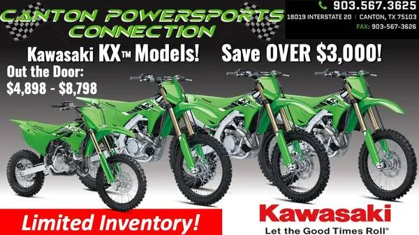 ‼️NEW 2025 KAWASAKI KX™ MODELS‼️ COMPLETE DRIVE OUT PRICE: Including ALL Fees, Registration, and Taxes 2025 KX™ 85: $4,898.00 2025 KX™ 250 X: $7,898.00 2025 KX™ 450: $8,598.00 2025 KX™ 450 x: $8,798.00 CANTON POWERSPORTS CONNECTION 18019 Interstate 20 Canton, TX 75103 Give us a call at:903-567-3625 Or view our website for other available inventory: Cantonpowersportsconnection.com 2025 Kawasaki KX 250 X The all-new KX 250 X motorcycle takes cross-country racing to the next level. Tuned for off-road racing, advanced tech like Power Mode Selection and Kawasaki TRaction ControlKTRCcombine with a high-performance chassis, a more powerful engine, and off-road ready suspension to equip this championship-proven race machine for the most technical terrain. Climb the ranks quickly and confidently with the bike built for victory. Be Next on the KX 250 X. Features may include: POWER & PERFORMANCE CROSS-COUNTRY POWER The all-new KX 250 X motorcycle is built for cross-country domination. The anatomy of this powerful engine includes finger-follower valve actuation, a downdraft-style intake, and dual injectors. It’s our most competitive racing package to date. ADVANCED TECH INNOVATION WINS In today’s ultra-competitive cross-country landscape, success at the highest level is aided through advanced tech. The all-new KX 250 X motorcycle is now equipped with smartphone connectivity and electronic controls sourced directly from Kawasaki factory racing efforts, placing all-new functionality at your fingertips. CROSS-COUNTRY HANDLING OUTSTANDING CONTROL Features like an all-new, lightw 8 perimeter frame, updated Showa 48 mm coil-spring fork, and Uni-Trak® rear suspension sharpen handling performance on every section of the course and make this championship-caliber bike a force to be reck 1 d with. ERGONOMICS & STYLE THE KX™ DIFFERENCE Thanks to ERGO-FIT® adjustable comp 1 nts, you can optimize your riding position to unlock the bike’s massive performance potential. Sleek bodywork and bold, factory-style graphics stand out from the crowd while holding fast to the winning reputation of KX™ motorcycles. ADDITIONAL FI settings optimized for off-road New exhaust for improved power and mass centralization Revised intake downdraft angle and optimized fuel injection settings Revised piston shape New single-shaft primary crankshaft balancer C 1 d disc-spring hydraulic clutch Showa 48 mm coil-spring fork and single shock with revised settings New ODI lock-on grips New bodywork and shrouds for improved rider interface New airbox shape with quick-release side cover 12 V bullet terminal for aftermarket accessories GIVE US A CALL OR COME BY TO TAKE ADVANTAGE OF OUR GREAT PRICES Canton Powersports Connection 18019 Interstate 20 Canton, TX 75103 903-567-3625 Or view our website for other available inventory: Cantonpowersportsconnection.com ATV, farm, Texas, mower, Motorcycle, Kawasaki, Mule, Teryx, pro, eps, 610, 4010, side x side, off road, ranch, garden, 4010, 4010 trans, Polaris, ranger, general, can-am, maverick, x 3, commander, defender, Yamaha, Viking, grizzly, xm 5, all terrain vehicle, sportsman, scrambler, renegade, outlander youth, sx, Harley, Davidson, Yamaha, Honda, Suzuki, KTM, Kubota, John Deere, property maintenance