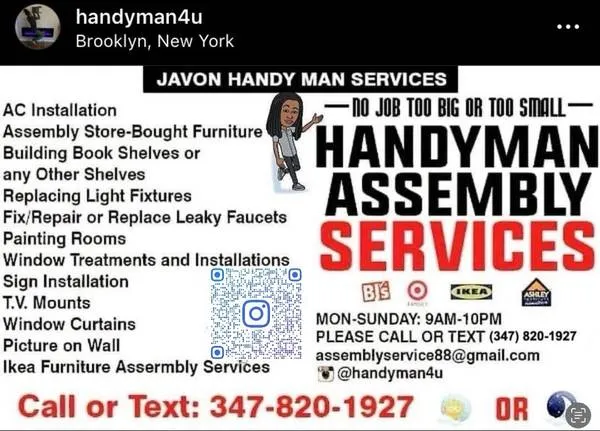 SAME DAY HANDYMAN & IKEA ASSEMBLY SERVICES ALL NYC BOROUGHS Air Conditi 1 rs, AC, Blinds Shades TV A/C Installations IKEA CB 2 Furniture Assembly, IG@Handyman 4 u CAll or TEXT 347-820-1927 Blinds Shades TV A/C Installations IKEA CB 2 Furniture Assembly TV A/C Installations IKEA Furniture Assembly NYC NY Handyman Astor Radio Strivers Row Tudor Alphabet Marcus Garvey Gramercy Park City Bowery Chelsea Midtown Lincoln Center Columbus Circle Cooperative Greenwich West Village Soho Nolita Noho, IG @Handyman 4 u view pics of all type of work d 1 here Professional Handyman, Neat and Always On Time, Will Take Care of ALL Your Home Improvement Needs and Odd Jobs, CALL 347-820-1927 FREE ESTIMATE, Specialized in the small jobs you never fined the time to complete or for some reason cantdont know how, dont have the tools, dont have the time, feel safer if a professional handyman doing it * Flat screen LED LCD Plasma TV installation on any wall type, * Window Room A/C Air conditi 1 r installation, * Furniture Assembly, rearranging, moved in your house, repair, * Shelves, Shelving Systems, mount, repaired, installed, * Curtains, Motorized Blinds and Shades installation, * Ceiling fans, Light Fixtures, Track Lights, Chandeliers, Installed or Replaced, * Light switches, Dimmers, Power Outlets, replaced, * Pictures, Mirrors, Painting, Art Work, hung, * Closets Sliding Doors Bi fold Doors Track fix replace, * Door Hinges and all associated hardware fix, change, doors aligned, * Wood and Metal repair, minor cracks and holes filled, sanded and painted, * Door locks + knobs, repaired, replaced and installed, * Shower Heads replaced, Towel bar installed, Medicine Cabinet Installation, * Faucet and Sink replacement installation, * Caulking and Grout, Shower Stalls, Bath Tubs, Toilet Bowls, Tile repair, * Dry Wall repair of holes, cracks, water damage, * Painting Indoor and Outdoor, * Staining Decks and Patios, Lawn and Garden Furniture, * Hanging Plants installed,#backfridaydeal IG @Handyman 4 u , Handyman in Brooklyn Queens Bronx Long Island NEW jersey upper Midtown west side, handyman in upper Midtown east side, handyman in Manhattan, handyman in NYC, handyman in upper manhattan, handyman in midtown Manhattan, handyman in marble hill, handyman in inwood, handyman in fort George, handyman in Hudson h 8 s, handyman in Washington h 8 s, handyman in, Hamilton h 8 s, handyman strivers row, handyman in Astor row, handyman in sugar hill, handyman in ManhattanVille, handyman in viva, handyman in Spanish Harlem, handyman in east Harlem, handyman in Manhattan valley, handyman in Morningside h 8 s, handyman in Carnegie hill, handyman in Yorkville, handyman in Lincoln square, handyman in upper west side, handyman in upper east side, handyman in Lenox hill, handyman in midtown, handyman in Columbus circle, handyman in Sutton place, handyman in diamond district, handyman in theater district, handyman in turtle bay, handyman in midtown east, handyman in Tudor city, handyman in time square, handyman in Hudson yards, handyman in midtown west, handyman Murray hill, handyman in tenderloin, handyman in Madison square, handyman in flower district, handyman in Brookdale, handyman in kips bay, handyman in rose hill, handyman in peter cooper village, handyman in Chelsea, handyman in flatiron district, handyman in gramercy, handyman in union square, handyman in Stuyvesant town, handyman in meatpacking district, handyman in waterside plaza, handyman in downtown Manhattan, handyman in little Germany, handyman in alphabet city, handyman in loisaida, handyman in east village, handyman in Greenwich village, handyman in Noho, handyman in Soho, handyman in lower east side, handyman in west village, handyman in bowery, handyman in Nolita, handyman in little Italy, handyman in Chinatown, handyman in lower Manhattan, handyman in financial district, handyman in 5 points, handyman in cooperative village, handyman in 2 bridges, handyman in Tribeca, handyman in civic center, handyman in Radiorow, handyman in south street seaport, handyman in battery park city, handyman in Roosevelt island. Handyman in hell’s kitchen, handyman in Clinton, handyman in garment district, handyman in herald square, handyman in Koreatown, NYC, nyc Handyman, 10001234567890,