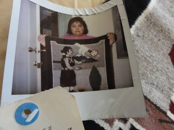 1-Of-A-Kind Highly Unusual Pictorial Rug Wall Hanging of a Navajo Woman Praying and Entreating the Yei God by Sprinkling Corn Meal or Corn Pollen on the Ground which the Yei Deity Sees and Is Crossing Over the Sacred Mountain to Receive It. Highly Unusual Theme. Purchased new in Chinle, Arizona about 2005 and in storage since then. Handmade by Navajo rugmaker Rita Gilmore. Handspun wool and dyed. I am told by Navajo from the area the mountain most looks like San Francisco peak above Flagstaff, AZ., 1 of the 4 mountains sacred to the Navajo, and is not far from Chinle, AZ where the rug was purchased New about 2005 at high school graduation time. Almost all Yei rugs portray an inline dance ritual. This unusual rug portrays a personal relation to a Yei in a clearly religious, spiritual ritual. I myself in 40 years have never seen a scene of similar personal involvement and meaning. Rug has been in storage all these years and comes with a certificate of authenticity from the Navajo Arts and Crafts Enterprise, and a photo of the weaver, Rita Gilmore. Rug is, of course, all wool, handwoven, with natural vegetal dyes and radiant colors. No shipping. Sale upon satisfactory inspection. Payment in cash only; exchange to be made at safe location such as public library. May phone me at: 412-916-7268. Thank you for your interest.