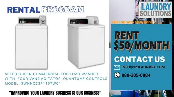 We will install laundry equipment and carry out all breakdown and regular maintenance required. Our rental rates are very competitive. Example Rental Costs: First and Last month plus delivery and installation due at signing 1 Commercial grade top load washer - $50.00/month 1 Commercial grade dryerGas or Electric- $50.00/month Delivery and Installation - $75.00 Rental agreement: 6 Months Minimum Benefits: -All repairs and maintenance carried out at no charge. -The owner retains the cash box keys and collects the revenue. -Heavy duty Laundromat quality equipment, coin operated. -Reliability, easy operation and minimal utility usage. -Prompt 7 day service by qualified technicians. -Fixed Operating Expense , Rental payment includes the equipment and service. -Short and Long Term Contracts Available. -1 Payment Includes the Equipment and Maintenance Expenses. Our services: Provide professional installation of the latest, most energy-efficient laundry equipment into your premises. -Delivery and installation within 48 hours -Provide preventative maintenance on the equipment Offer state of the art commercial grade laundry equipment from Speed Queen, Whirlpool, Milnor, and Maytag. Product Overview: Rental Speed Queen Top Load Washer, 14 lbs Capacity, Coin Operated, Model: SWNNC 2 SP 115 TW 01 BUILT FOR RELIABLE PERFORMANCE Touch pad control with sound annunciator 27 cycle selections U.S. DOE compliance for energy and water efficiencies Extract speed of 710 RPMs spins clothes out drier Secured coin vault meter case Commercial-grade stainless steel or porcelain enamel washtub Automatic balancing suspension system QUANTUM CONTROL Easy-to-read digital display Cycle programming flexibility Multi-level vend pricing Individual cycle modifier keys Card and coin transactions Wash Alert™ with SPECIFICATION Appearance Color White Control Panel Selection Rear Meter Case Standard Water and Energy Info Modified Energy Factor “MEF” ft³/kWh/cycleLiters/kWh/cycle- 1.6947.89 Water Factor “WF” gal/ft³Liters/Liter/cycle- 7.91.06 Water Consumption - galLiter 24.693.0 Technical Info Basket Volume - 3.26 cu. ft.92.3 liters- Stainless Net W 8 - lbkg- 19086 Shipping W 8 - lbkg- 21095 Electrical Requirements - 120/60/115 amp Overall Dimensions WxDxH - inmm: 255/8651 x 28711 x 431092 Cabinet H 8 - inmm 36914 Temperature - Hot, Warm, Cold . Cycle - Light, Medium, Small Load, Normal, Perm Press, Delicates Motor 1/2 HP Water Pressure PSIBar 20-1201.4-8.3 Spin Speed - RPM- high 710, low 4742 Speed Performance/Features Secured Automated Audits Soil Level Modifiers Rear Self-Leveling Legs Service Alert capable About Us: We pride ourselves on offering quality new and used laundry equipment at low prices backed by our years of refurbishing and distribution experience. We carry a variety of equipment types ranging from: new, floor model, like new, refurbished, used, as well as as-is condition washers and dryers. Each machine is evaluated and tested prior to classification. Machines come with warranties as detailed in product description. As owner/operators of our own laundromats, we understand the nature of our industry and place a priority on keeping parts available to our customers for all maintenance needs. We carry hard-to-find parts for older model washers and dryers as well as common replacement parts for all your business needs. In addition, we offer everything from laundry carts to bill change machines, vending machines, coin slides, and lock and key replacements. If you have a specific part or equipment need, feel free to contact us with your part or equipment request and we will work with you to keep your laundry business in optimal condition. ...improving your laundry business is our business 901 E Lambert Rd J La Habra, CA 90631 123 laundryshop.com 714-442-0330