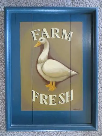 VINTAGE JOYCE LANGELIER DESIGNS HAND PAINTED FARM FRESH W/GOOSE WOODEN WALL ART. 19-1/2 x 14-3/4. NICE CONDITION AS SEEN. $20.00 CONTACT JOE AT 609-617-7519