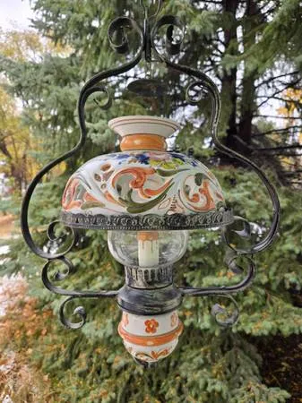 Vintage hanging swag fixture made mid century in hand painted ceramic with metalwork frame. Measures 22 tall excluding chain, works fine and is in good vintage condition. Cash only $135 text 612-584-3614