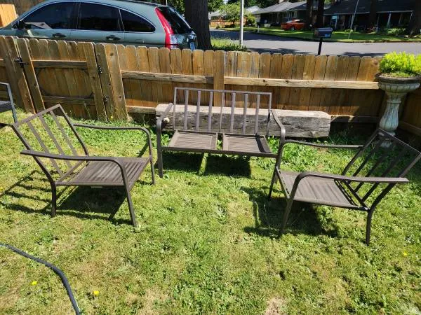 This is a Set of Modern Outdoor/Patio Furniture and They are in Excellent Shape and Very Sturdy and Strong. Each Piece is Made From Bronze/Brown Aluminum/Metal and Everything Comes to You Already Assembled and Ready to Use! There is a Loveseat, and 2 Matching Chairs, to Make a Complete Set. This Set Only Includes the Furniture FramesNo Cushions But They Can be Bought Separately Anywhere Fred Meyer, Home Depot, Lowes etc. The Patio Furniture Frames Have NO Damages and the Sling Style Seats are Strong. It is Currently Up for Sale for Way Less than Retail For the Set. All Pieces are Durable and Strong and Made from Quality All Weather Materials. Dimensions are As Follows: LOVESEAT: 45 Wide, 28 Depth, 27 Tall Total H 8, 13 Seat H 8. CHAIRS: 25 Wide, 28 Depth, 27 Total H 8, 13 Seat H 8. These are Just the Measurements of the Frames and Are Subject to Change When You Select/Add Cushions. This is a High Quality Set that Will Last Many Seasons When Cared for Properly. We are Always a Smoke FREE Household and These Pieces Have Been Well Cared For, Are Super CLEAN, and Ready to Go Today. Perfect for Your Patio, Deck, Lawn or Outdoor Space and Already Assembled for You. I Have Included Many Images, in Excellent Lighting, From All Angles, So You Can Clearly See the Outdoor Patio Loveseat and 2 Chair Set Available for Sale Here. SEE ALL IMAGES. To View/Purchase In Person Contact Sara @ 541-610-4633 OR Isaiah @ 541-848-8144. Call/TEXT or email are All Good with TEXT Being the Preferred Contact Method. We are Centrally Located in East PortlandMill Park, Just 5 Minutes East of I 205 Freeway and The Map is Correct on this Posting. This Great Set of Matching Outdoor Patio Furniture is Priced to Sell QuicklyFIRMand Will Not Last Long-Contact Us Today! NO HOLDS, SERIOUS BUYERS, LOCAL, IN PERSON, CASH ONLY SALES PLEASE!!!