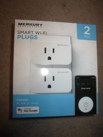 this is a Sealed Box New Merkury Smart WiFi Plugs 2 Pks 1 Box 2 Packs for $15 2 Boxes 4 Packs for $25 Features: Wi-Fi is Built into the Plug - No Hub Required Turn Any Appliance into a Smart Product and Power it from Anywhere Compatible with Voice Assistance like Alexa, Google Assistant or Microsoft Cortana Easy Installation - Just Plug In, Install the App and Connect! Set your Appliance on a Schedule or Timer Slim White Design - Saves Space and Blends in with your Outlet if interested, please Call, Text or Email