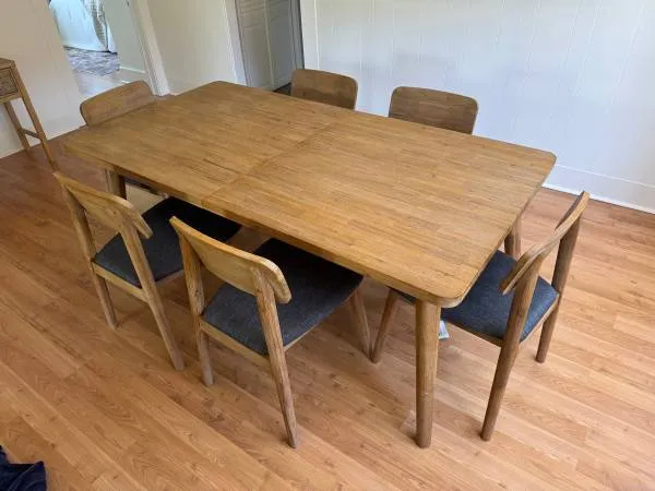 Castlery Seb 9-pc dining set solid acacia wood expandable table Table retails 1099$$ Chairs retail 498$ for 2 This was used in a home staging job 2 times. Like new condition 323-768-7600 text or call me Asking 2500$ for all of it 8 chairs and 1 tablepic shoes 6 chairs but we have 8 Dimension: W 74.8/94.5 x D 39.4 x H 29.5 Table Top Thickness: 1.6 Product W 8: 152.1 lbs Capacity: Sits 8 People Comfortably Leg H 8: 28 Leg to Leg Distanceat h 817.7: ...