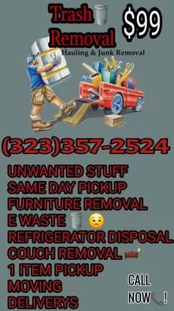 323-357-2524 WE CHUNK YOUR JUNK Our Removal Services FURNITURE We will remove most household furniture such as old Sofas, BedsMattresses and Box Springs, Tables, Chairs, and more! APPLIANCES Have an old kitchen appliance that stopped working or upgraded? Wed be happy to come remove it for you. YARD/BUILDING WASTE That time of the season? Just finished remodeling? We can take a variety of construction and yard waste. ELECTRONICSE-WASTE Cleaning out the office or have outdated electronics laying around? Let us properly dispose of these items for you. starting price of $99 we price based on volumehow much space your yunk take on our truck. just point the junk you want remove and will make it disappear!!!!! Just like that you point and magically will be out of your home or business 100 % SAFE DISPOSAL. we take away your unwanted stuff residential & commercial foreclosure clean out yard clean up junk removal trash removal appliance removal garage clean out dirt removal dirt clean up attic clean out small loads 1 item moving service small demolition haul away anything same day service clean ups washer removal soil removal pallet removal mattress removal junk removal los angeles junk removal orange county junk removal long beach PLS CALL FOR A FREE ESTIMATE 323-357-2524 . . *HOUSE CLEAN OUTS *BUSINESS CLEAN OUTS *GARBAGE CLEAN OUTS *ATTIC CLEAN OUTS *STORAGE CLEAN OUTS *BACK YARD CLEAN OUTS* *HOUSEHOLD JUNK & MISC CLUTTER *DRIVEWAY CLEAN OUTS *COMMERCIAL / OFFICE CLEAN OUTS *FURNITURE / SOFA / CHAIRS / DRESSER ETC. *APPLIANCES, REFRIGERATOR, WASHER/ DRYER *ELECTRONIC TV. COMPUTER ETC *CONSTRUCTION DEBRIS *CEMENT / BRICKS REMOVAL *DIRT GRAVEL REMOVAL *TRASH REMOVAL * DEMOLITION WORK AND REMOVAL. * HOT TUB REMOVAL * ESTATE CLEAN OUTS * ALSO PURCHASING JUNK CARS * DELIVERY SERVICE AVAILABLE San Fernando Carpet cleaningAgoura Hills 91301 Alhambra 9180191803 Altadena 91001 Arcadia 9100691007 Artesia 90701 Avalon 90704 Azusa 91702 Baldwin Park 91706 Bell 90201 Bellflower 90706 Beverly Hills 902109021190212 Burbank 9150191502915049150591506 Calabasas 91302 Canoga Park 9130391304 Canyon Country 9135191387 Carson 9074590746 Castaic 91384 Cerritos 90703 Chatsworth 91311 Claremont 91711 Compton 902209022190222 Covina 917229172391724 Culver City 9023090232 Diamond Bar 91765 Downey 902409024190242 Duarte 91010 El Monte 9173191732 El Monte - South 91733 El Segundo 90245 Encino 9131691436 Gardena 902479024890249 Glendale 9120191202912039120491205912069120791208 Glendora 91740 Glendora 91741 Granada Hills 91344 Hacienda H 8 s 91745 Harbor City 90710 Hawaiian Gardens 90716 Hawthorne 90250 Hermosa Beach 90254 Huntington Park 90255 Inglewood 9030190302903039030490305 LA Los Angeles 9000390004900069001090011900129001590016900189001990020900239002790029900349003590036900379003990047900579006290063 La Canada Flintridge 91011 La Crescenta 91214 La Habra H 8 s 90631 La Mirada 90638 La Puente 9174491746 La Verne 917509004490059 August F. Haw 90061 Baldwin Hills 90008 Bel-Air 90077 Boyle H 8 s 90033 Bren 2 od 90049 Century City 90067 City of Commerce 90040 Dockweiler 90007 Eagle Rock 90041 East L.A. 90022 Echo Park 90026 El Sereno 90032 Firest 1 Park 90001 Glassell 90065 Highland Park 90042 Hollywood 9002890068 Ladera H 8 s 90056 Lincoln H 8 s 90031 Mar Vista 90066 Rancho Park 90064 Sanford 90005 View Park/Windsor Hills 90043 Watts 9000290025 Westchester 90045 Wes 2 od 90024 Lake Hughes 93532 Lakewood 907129071390715 Lancaster 935349353593536 Lawndale 90260 Littlerock 93543 Llano 93544 Lomita 90717 Long Beach 9080290803908049080590806908079080890810908139081490815 Los Angeles 9002190058 Lynwood 90262 Malibu 90265 Manhattan Beach 90266 Marina del ReConstruction Debris Furniture Removal Appliance Removal Bulk Trash Removal Brush and Tree Limb Debris Removal Garbage Removal, Trash Removal, and Junk Removal Remodeling Debris Clean up Warehouse Clean out Storage Unit Clean out Garage Clean out Shed Clean out Garage Sale clean up and Yard Sale leftovers Rental Home and Apartment Clean out Foreclosure and Eviction Clean out Move-Out Services Hoarding Clean outs Light Demolition Wood and Tree Branch Cleanups Yard Cleanups Dumping Services Trash Haul off Hot Shots Mobile Home - Trailer Demolition Delivery Services Curbside pick up Couches-Sofas --- Loveseats --- Any Furniture. Appliances --- Scrap metal --- Refrigerators - freezers - stoves - washer and dryer Treadmill- -office chairs-tables--yard debris--leaf’s-wood-TVs--computers. clean out: house--storage--sheds-buildings---barns Household -- Furniture - appliances -trash---yard waste---etc. Computers electronics recycling.Basement - Garage - Attic cleanouts Construction debris.cleanouts Residential Garage cleanout Remodeling trash Junk metal I also do single item removal junk metal removal Real Estate/rental Clean Outs --foreclosure--Items left behind by prior. garbage and junk of all kinds. From basements, attics, garages, storefronts, warehouses, office buildings, apartments, condos, high rises, construction sites, vacant land and much more. With our unique service, we can remove a lifetimes worth of clutter from your home or business in just a few hours or less. l. Moving dolly labor help debris Uhaul unload cheap affordable mount tv cleaning carpet yard cleaning back yard front yard patio Weed Pulling Clearing Branches,Leaves,Clutter Cleanups washer and dryer installation door removal metal scrap , digging dirt removal trash bags Tree trimming, pruning, removal,tree planting,brush removal, EMERGENCY TREE SERVICE, stump grinding, and firewood Remove,tree,bush,shrub,palm,stump grind,root removal,tree trimming,remove tree,wood chipper,insured,licensed,brush Window Washing WashingGutterCleaning Roof Cleaning removal Solar Panel Cleaning removal Skylight Cleaning removal Shower Door Cleaning removal Hard Water Stain Removal Window Film removal Screen Repair removal AIR CONDITIONING Removal HEATING REPAIR removal AIR CONDITIONING Removal HEAT PUMPS removal MINI SPLIT INSTALL