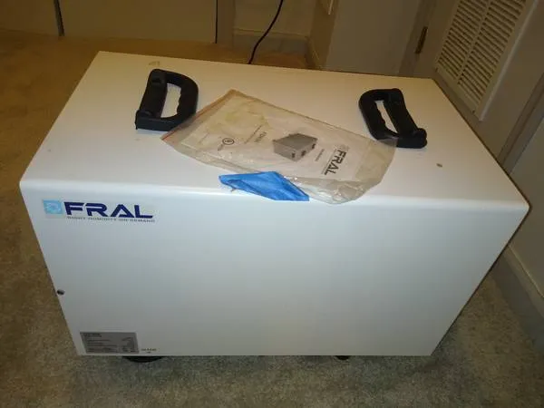 A very good condition FRAL FDK 54 digital humidistat Right Humidity for large room machine. More than a dehumidifier, this beast sets the humidity. Moving out of large home so no longer need it. Why pay over $1100 for a new one when you can buy this one for a fraction of the cost. Text, call or email for pickup. Digital Humidistat - allows you to select your desired humidity level (between 35% and 99%) and automatically detects current moisture levels. Has continuous drainage. Weight: 68 lbs. Dimensions: Height: 16.5 | Width: 13.8 | Depth: 22.8 Handles: Yes | Top of Unit Caster Wheels: No | (4) Sturdy Rubber Feet Amperage: 4.9 Amps Wattage: 510 Watts Voltage: 115 Volts Noise Level dB(A): 51 dB(A) Refrigerant: R410A | Eco Friendly Safety Certification: UL® Listed