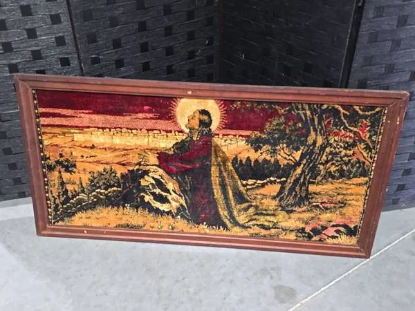 Beautiful Vintage 41 x 22 Framed Velvet Religious Piece I have more items on my Facebook Page Music City Antiques Call Marty at 615-948-6177