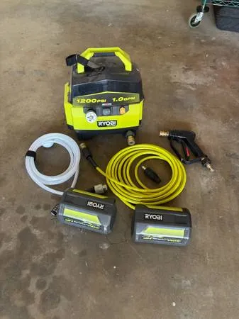 Ryobi 40 V HP high power 1200 psi 1 gallon per minute pressure washer with 26 ah high capacity, HP lithium ion batteries and multiple angled nozzles All of the fittings are quick connect 40 v This is a great power washer and works well for detailing cars and other projects If interested, please contact me at 719-329-4584 No charger included. Batteries work with Ryobi lights, lawn mowers, trimmers, edgers, chainsaws, backpack, blower, power station, snowblower fans, hedger, tiller, etc. ...