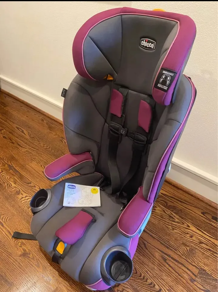 This is a Chicco DuoGuard child car seat in excellent condition. The seat features a stylish gray and purple color scheme and comes with dual cup holders and side impact protection. Padded seat, armrests, and adjustable harness offer comfort and security for your child. Instruction manual is included. Minimal signs of wear, clean, and well maintained. Suitable for multiple age groups with easy installation in most vehicles.