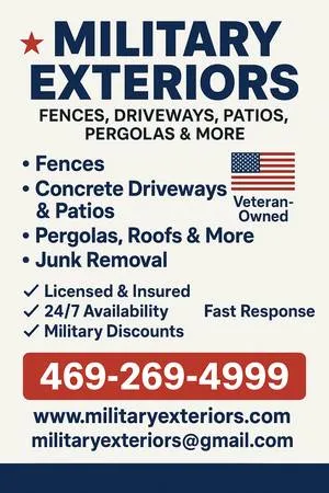 * Fence install, repair, and removal * Junk removal / brush clearing/ storm cleanup * Veteran owned and operated * Free estimates! Fast responses! * Call or text us now! 469-269-4999 * Serving all of Dallas Fort Worth