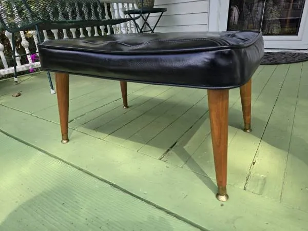 Vintage footstool made mid century with tapered pencil legs and vinyl upholstery. Measures 14 T 24 L 16 W and is in good vintage condition. Cash only $100 text 612-584-3614