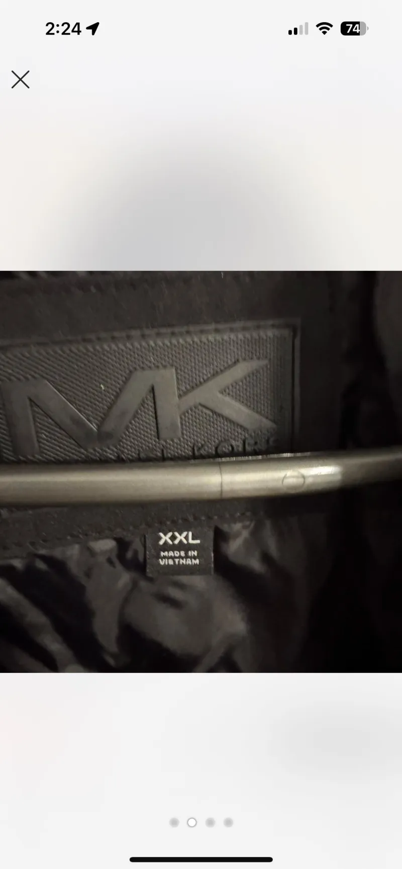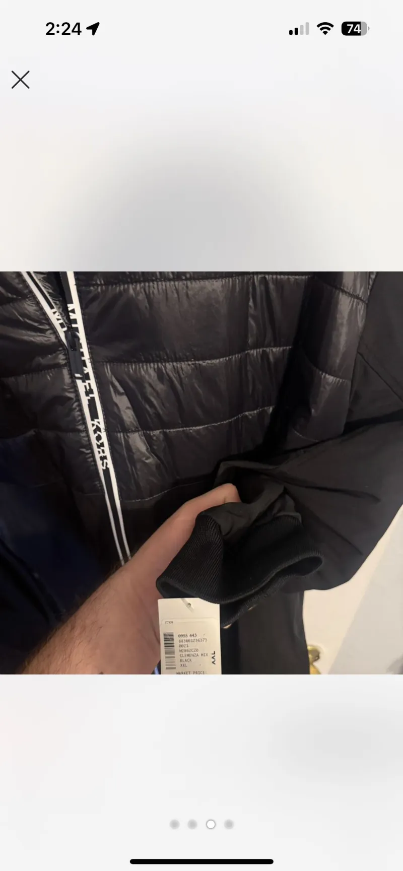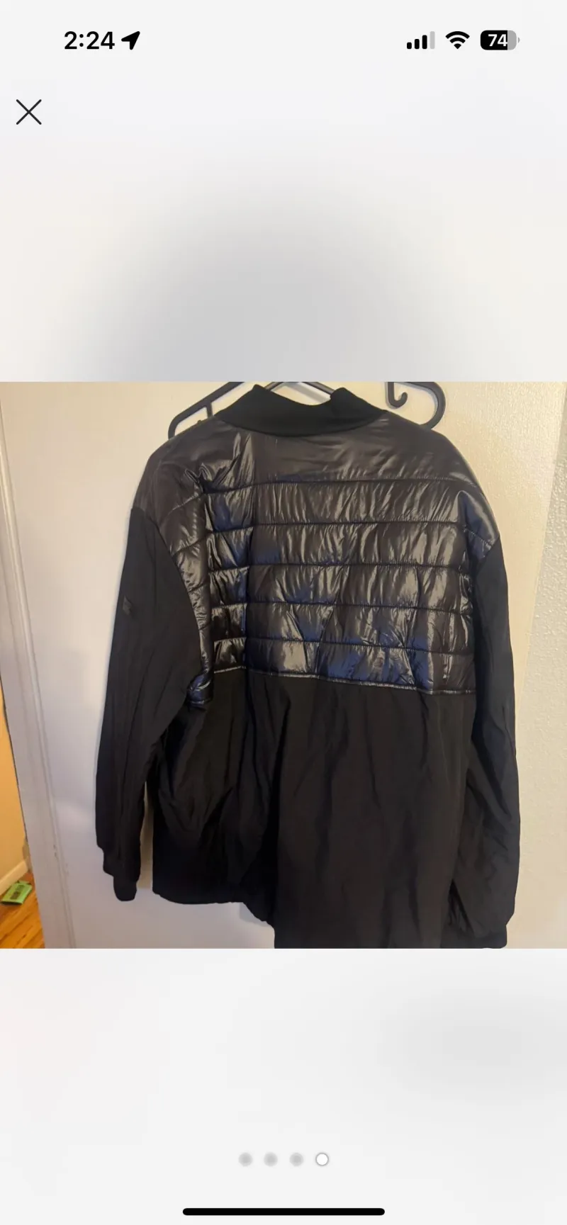 Stylish black puffer jacket with sleek design. Features zip closure and side pockets. Ideal for cold weather.