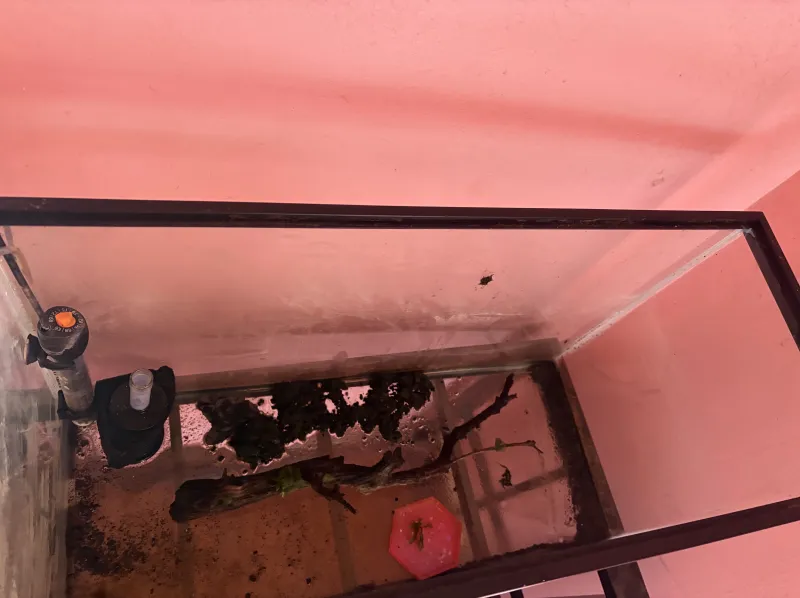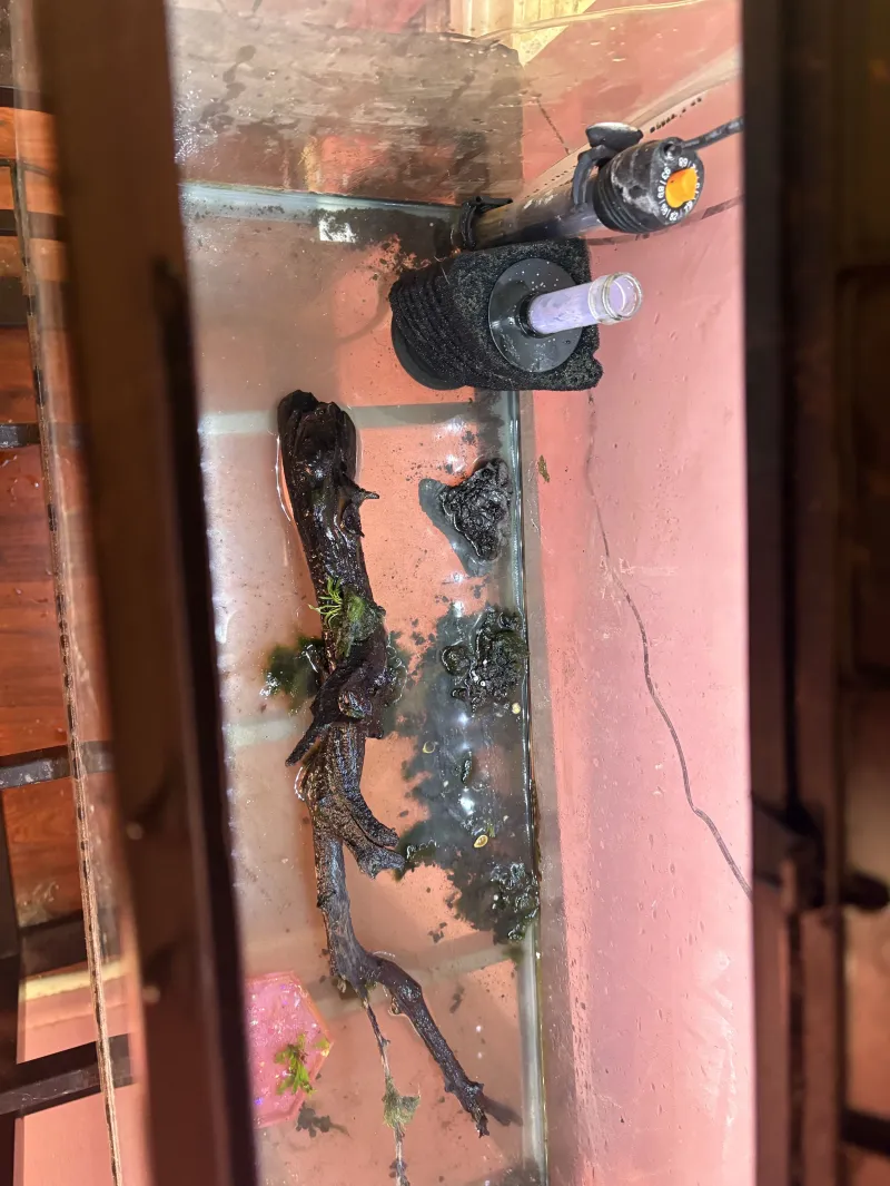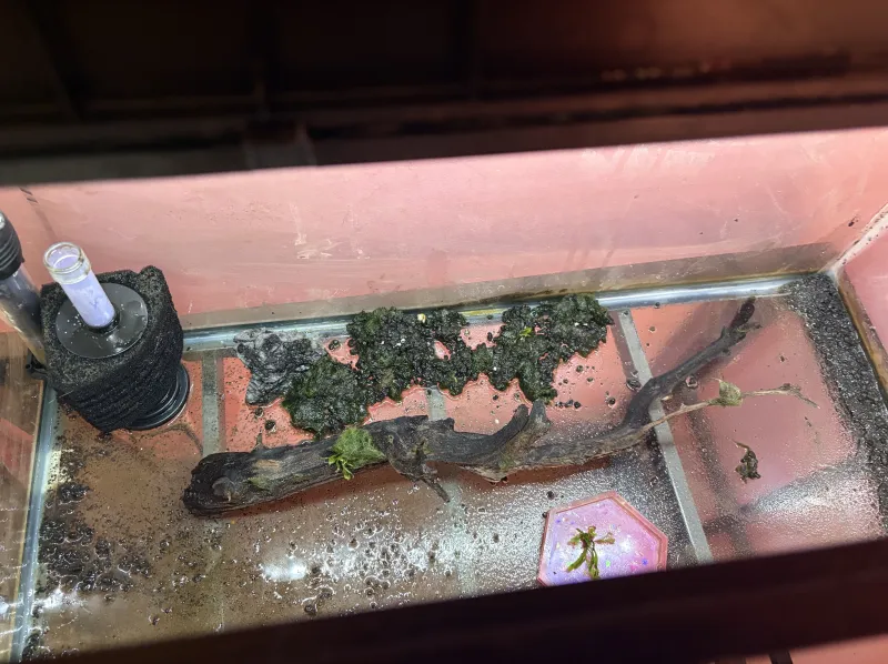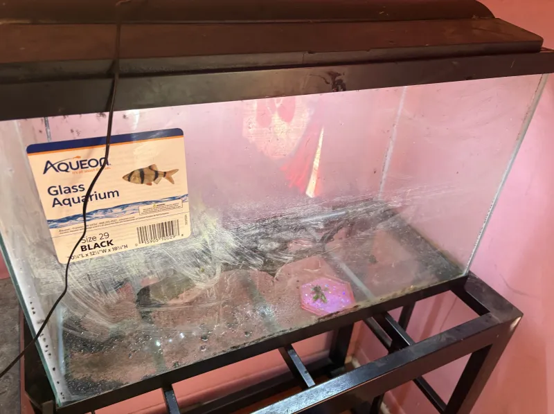Comes with~ -aqueon 29 gallon tank - lid with fluorescent light - aquarium heater - sponge filter - airline tubing - pump - resin bottom feeder/invert feeding plate - real driftwood with live moss and a baby Java fern attached - live moss - live baby Java fern - artificial rock cave - thermometer - stainless steel aquarium stand