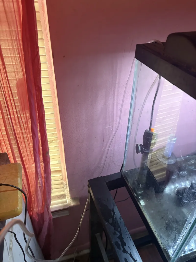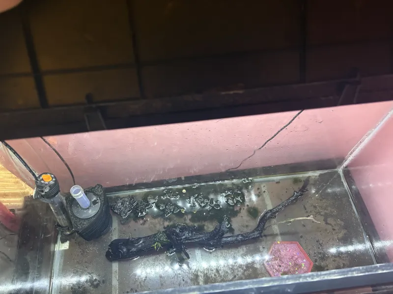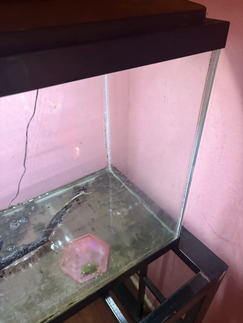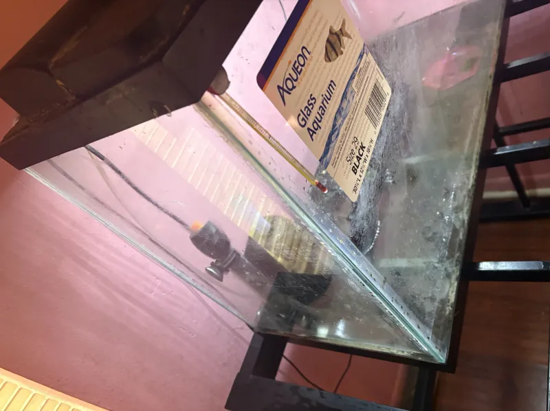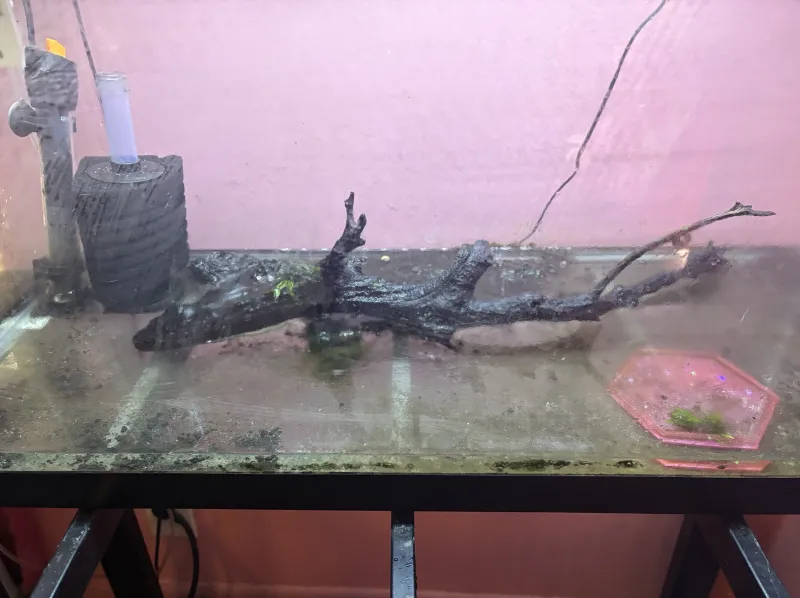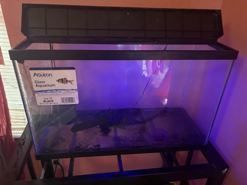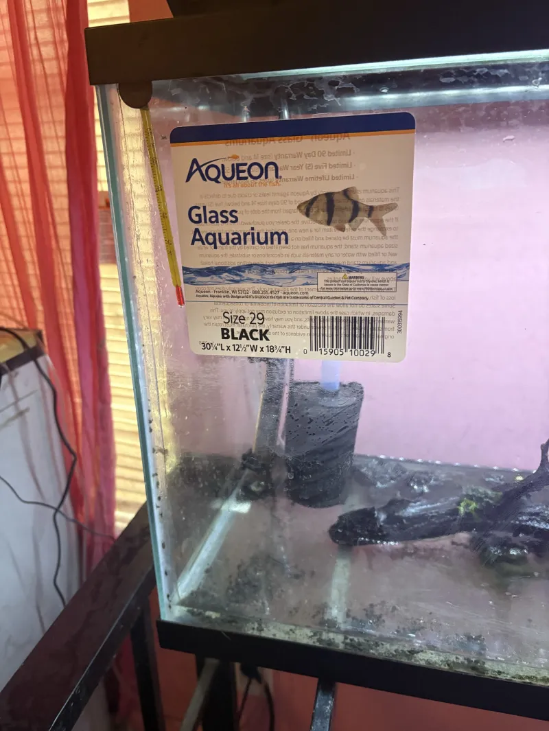 A 29-gallon used aquarium with its complete setup is available for sale. • Aqueon 29-gallon tank (the tank is dirty and slightly scratched from scraping algae, but there are no leaks, so it works as it should). It’s being sold for $20, which would be a $50 tank if it were new. • lid with fluorescent light • aquarium heater • sponge filter • airline tubing • pump • resin bottom feeder/invert feeding plate • real manzanita driftwood with live moss and a baby Java fern attached • live mos