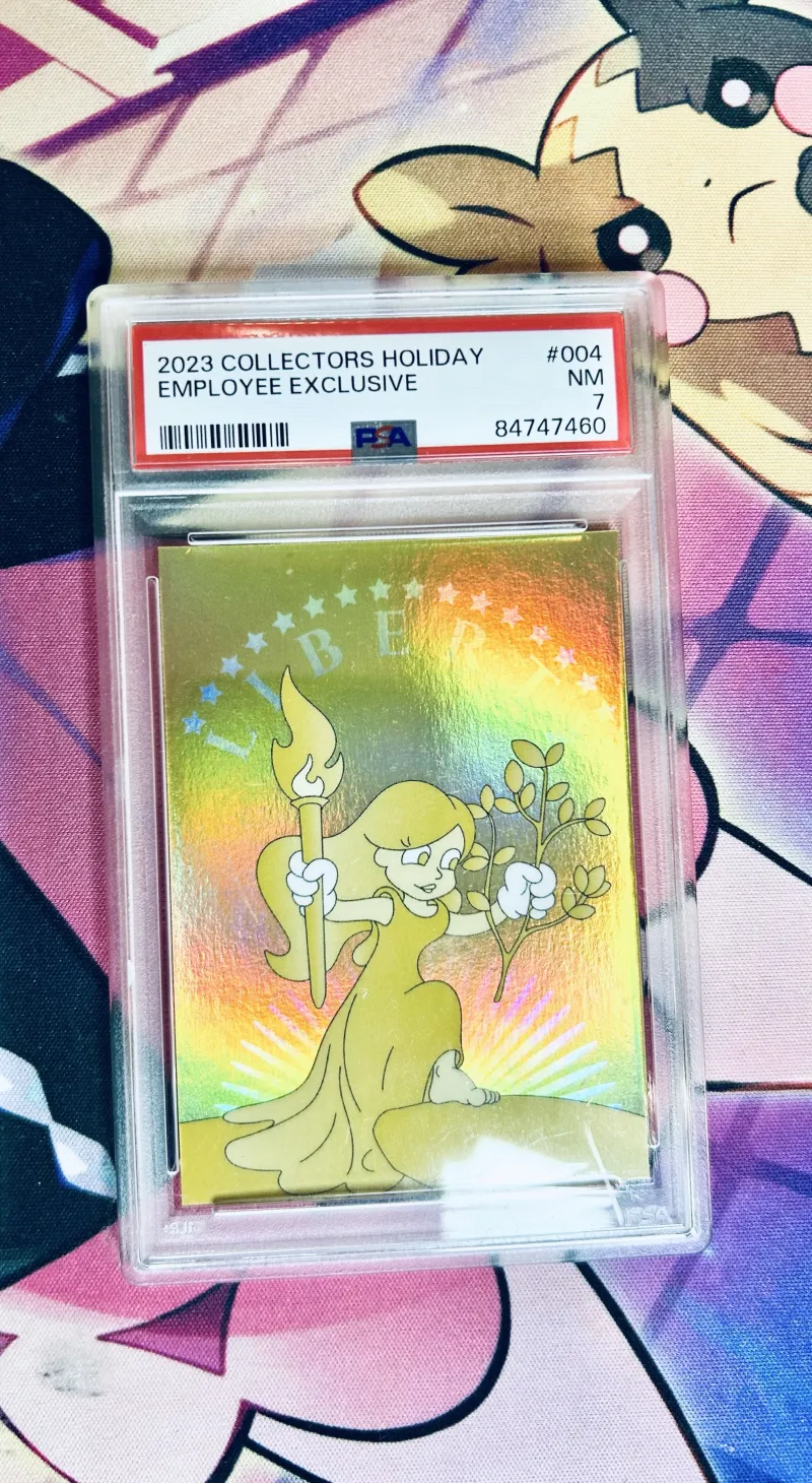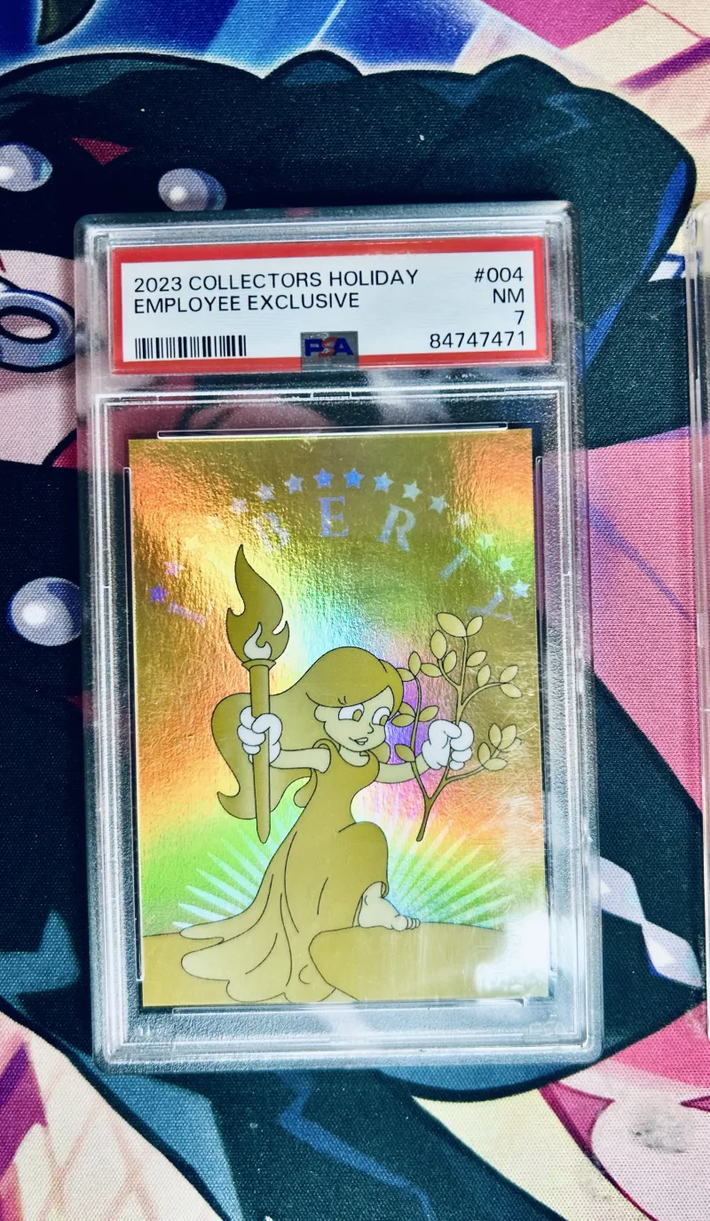 Up for sale are two PSA-graded 2023 Holiday Employee Exclusive “Liberty Girl” holo cards. Perfect for collectors or resellers looking to add rare, limited-edition cards to their collection. • Year: 2023 • Edition: Holiday Employee Exclusive • Card: Liberty Girl • Quantity: 2 cards • Condition: PSA-graded Available for pickup in Hawthorne, NJ. Serious buyers only—message to claim them.